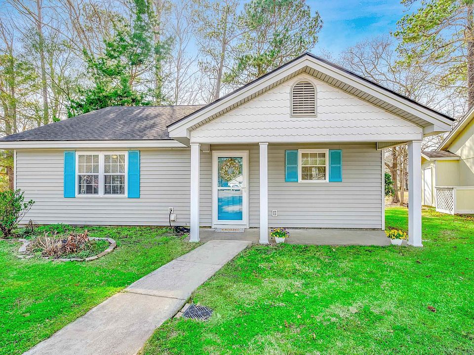 Come surround yourself with natural beauty at this delightful home located within the gated community of Myrtle Beach Golf & Yacht. The water view is absolutely remarkable from this wonderful single-level home. You will notice a charming front porch when you arrive. This is the perfect place to sit back and relax in your rocking chair while you enjoy the ocean breeze. As you enter through the foyer, you will be surprised by the high vaulted ceilings and the abundance of windows in the Carolina Room. This will give you the feeling of being one with nature even when you are inside. This enchanting home has an open concept with luxury vinyl flooring throughout. The kitchen has farmhouse-style butcher block countertops and a tray ceiling with recessed lighting. There is a breakfast bar and a closet that can be used as a pantry. The spacious owner's suite features a magnificent view of the water along with a big walk-in closet. The attached bath has an updated dual sink vanity with modern lighting. There is a large 11x12 guest room towards the front of this home and there's a third bedroom in the rear with an en-suite bath. The Carolina Room overlooks the water and it's a great place to sip on a cup of tea and read a good book. You could also use it as an office, art studio, or fitness area. There is an enormous 14x22 deck in the back where you can grill out with friends and take a break from reality. This lot backs up to the old golf course which is now owned and maintained by the homeowner's association. It gives you a sense of tranquility when you gaze off into this serene environment and there are trails where you can go for walks with your fur babies. The trees provide a comfortable amount of shade and you can watch the birds glide over the water in the mornings. This fabulous home has been properly cared for by the current owners since 2021 and they are even offering a home warranty for extra peace of mind. A new hvac system was installed approximately three years ago and the roof was replaced with architectural shingles in 2017. All of the window treatments and the washer/dryer shall convey. There is an additional parking for guests in the cul-de-sac and this home has an attached outdoor storage room where you can keep your beach and golf gear. This community has a special RV/Boat parking lot and the public ramp to access the Intracoastal Waterway is located at the end of Bay Rd. There is a resort-size pool and a hot tub near the clubhouse along with Pickleball, Tennis, & Basketball courts. This neighborhood is within the award-winning Saint James School district. This is a very convenient location and it's close to Surfside Beach, Market Common, and The World Famous Murrells Inlet Marshwalk! There are several top-notch golf courses nearby along with numerous fishing spots, delicious restaurants with live music, and plenty of places to go shopping. You can take advantage of the entire Grand Strand from here with easy access to Hwy 31. Schedule your showing today and don't forget to check out the 3D tour! Square footage is approximate and not guaranteed. Buyer is responsible for verification. Some photos in this listing have been virtually staged.