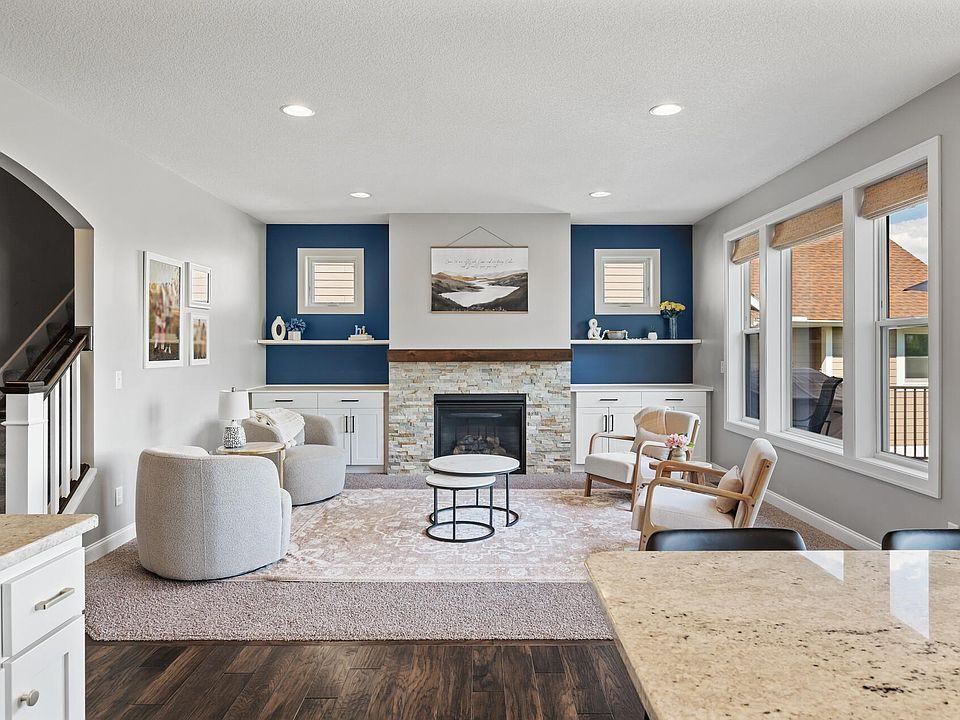 Gas fireplaceDark rich hardwood floorsOpen staircase designLake viewUpdated main level officeHigh ceilingsScenic green space