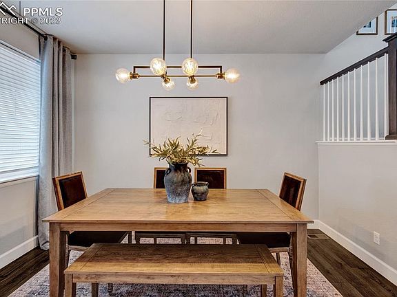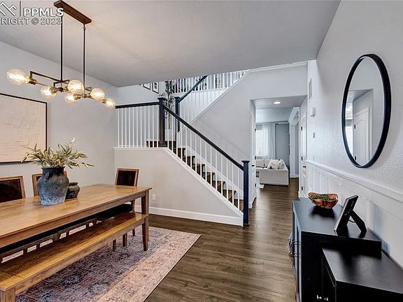 This beautiful home in the desired Banning Lewis Ranch neighborhood is completely move in ready! This home has it all! Style, sophistication and impeccable design throughout! Recently upgraded flooring, board and batten, baseboards, kitchen cabinetry including hardware, kitchen appliances, quartz countertops, light fixtures and the list goes on! Upper level loft is a perfect space for work or play! Upper level also offers 3 bedrooms including the primary bedroom suite complete with a 5 piece bathroom and large walk in closet with built in shelving. Beautiful, bright and open main level with dining room or formal sitting room, living room with gas fireplace, the most stunning kitchen, 1/2 bath and laundry. Lower level walk out with family room, 2 bedroom and full bathroom. Relax around the firepit on the stamped concrete patio enjoying the unobstructed mountain views! Banning Lewis Ranch features over 65 acres of parks and trails, two pools and a splash zone, pickle ball courts, a dog park, an exercise gym, a recreation center, an award-winning school and community events.