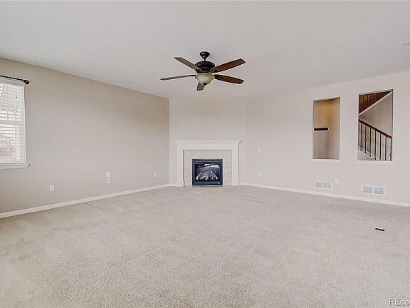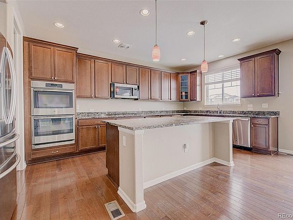 Built-in 2013, this Aurora two-story offers hardwood flooring, a fireplace, granite kitchen countertops, a walk-in pantry, a master bath granite vanity, an office, and a three-car garage.