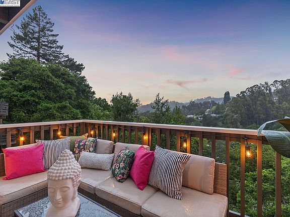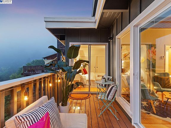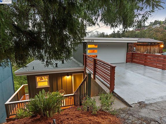 Tucked among the beautiful redwoods and eucalyptus trees of the Montclair Hills is this perfectly renovated, lovingly restored two bedroom, one bath ultra-charming bungalow rich with mid-century details, tree views, decks, enclosed garage, and bonus space. Near the end of a private cul-de-sac, the home features an open floor plan with large windows and inspiring views from the updated kitchen, living and dining areas. The stylish kitchen enjoys new appliances and direct access to the front deck. Refinished wood floors span the home, and the open beam ceilings add to the modern, natural aesthetic. The primary bedroom also has a sliding glass door to the back balcony, bringing you back again to the natural world. Other amenities include a bright, finished two-car garage (with window and new garage door) and an additional oversized laundry room/workshop–all resting on a generous 5,264 square foot lot. Just down the hill, Montclair Village provides shopping, dining, weekend farmers market, and two of Oakland’s most sought-after elementary schools. For your commute, there’s great access to Highway 13 and Highway 24 in either direction, and for your time off, there’s miles of walking trails and recreation in the East Bay parks moments away.
