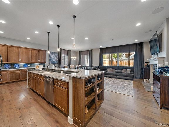 Impressive sprawling ranch with ultra RV garage/4 car siding to greenbelt in Cobblestone Ranch. Near new home has 10' ceilings and open floor plan. This stunning home has 3 main floor bedrooms and additional bedroom and bonus flex room downstairs. The gourmet kitchen features oversized island/breakfast bar, granite counters, upgraded 42" cabinets, ss GE appliances, 5 burner gas cooktop, conv. ovens, deep sink, incredible walk-in pantry and eating nook. The spacious great room has a wall of windows, high ceilings, gas fireplace and surround sound. Use one of the main floor bedrooms as an office if you need. The primary bedroom is situated for privacy and features a luxurious bath with split vanities, granite counters, tile floor, deep soaking tub, frameless shower, and walk-in closet with custom shelving. The two secondary bedrooms are a great size and have a hall full bathroom with dual sinks. The main floor offers upgraded hardwood flooring, and plantation shutters - large sliding door shutters are in garage and stays. The expansive finished basement features a large family room, spacious bedroom with walk-in closet, 3/4 bath, and bonus flex room with french doors. Easy to add kitchen/wet bar already plumbed with drain. Great storage area/workshop too. Step outside to the beautifully landscaped low-maintenance backyard, and large covered patio with gas hookup. Enjoy added privacy and space with the greenbelt to the side of house. The oversized 1,152 square foot RV garage has 18 ft ceilings, insulated, heated, and 50 Amp RV power circuit and water spigot. The entire home boasts almost 5,000 sq. ft. You will fall in love with this home's stunning curb appeal, elegant design, and upgrades throughout. Enjoy this wonderful neighborhood and all amenities it has to offer including the clubhouse, pool, tennis courts, parks, and miles of trails. Close to both Parker & Castle Rock for restaurants and shopping. This home is the ultimate and is in perfect condition. Wow!