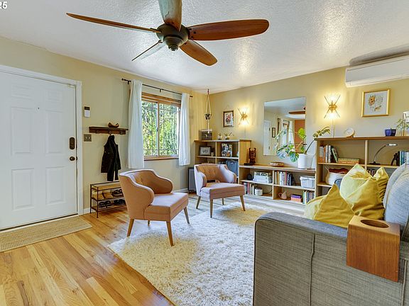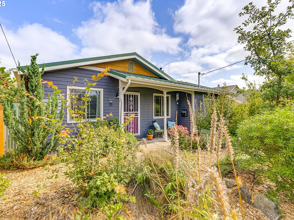 Welcome to this modernized mid-century ranch that blends vintage charm with smart, thoughtful updates—tucked into a private green oasis in Portland’s beloved St. Johns neighborhood. Set back from the street and framed by mature landscaping, the home features a sweet front porch—your perfect perch for morning coffee.Original hardwood floors run throughout an open-concept layout connecting a welcoming living room, formal dining area, and a bright, skylit kitchen. Recent updates include a farmhouse sink, butcher block countertops, gas range, stainless steel appliances, and modern lighting. A versatile bonus nook—ideal for a home office or creative corner—opens directly to the backyard through French doors, extending your living space outdoors.Efficiency upgrades include new windows, mini splits, a tankless water heater, and a durable metal roof. The attached garage offers laundry, built-in storage, and ample space for gear or hobbies.Step outside to a beautifully landscaped backyard designed with the green thumb in mind. Relax on the hardscaped patio, kick back under the covered area, or host friends in this bird and bee-certified habitat featuring mature fruit trees and diverse plantings. It’s a peaceful, private setting made for entertaining, gardening, or simply enjoying the day.All this is just minutes from groceries, restaurants, theaters, and the classic Portland vibe of St. Johns—with Pier Park’s disc golf course and swimming a quick jaunt away. Come see this quiet beauty in person. Schedule your tour today! [Home Energy Score = 10. HES Report at https://rpt.greenbuildingregistry.com/hes/OR10240033]