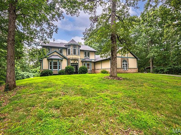 Tucked away on approximately 5 private acres, this custom-built Tudor-style estate offers the ultimate retreat surrounded by nature—no subdivision in sight! Designed for both grand entertaining and comfortable everyday living, this 4-bedroom, 3.5 bath home includes a spacious main-floor, vaulted, primary suite w/ dual vanities, and separate shower. Step into the soaring 2-story great room, where a floor-to-ceiling stone fireplace, with blower, makes a dramatic statement, flanked by two sets of double doors leading to a large composite deck (two years new)! The chef’s kitchen impresses with vaulted ceilings, custom cabinetry, a center island with cooktop, breakfast bar, pantry, and an oversized breakfast room that opens to a charming glass-enclosed sunroom. You’ll love the timeless details throughout, including crown molding, bay windows, and updated laminate floors! More to love are the formal dining room and cozy library/office with built-in bookcases. The walk-out lower level offers an expansive partially finished space—ideal for recreation or guests—with a brick fireplace, wet bar, full bath, and a bonus room/sleeping area! Bonus perks: brand new roof (2025), newer deck, some fresh paint, two water heaters, two HVAC - zoned, all electric house, new insulation in attic  (2024), main floor laundry, total tranquility atop a wooded hill. A rare opportunity to own a private, custom estate just minutes from conveniences—your peaceful escape awaits! Contact us to see it!
