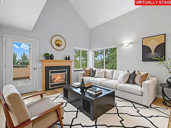 Discover serenity in this desirable 3-bedroom floor plan (3rd bedroom nicely converted to office with built-ins), featuring tranquil wooded South-facing views from your private balcony. This is the largest unit in the complex and the only one with two fireplaces (Primary and living room). Updated throughout and expanded by 395sf on the upper floor. The intelligently designed layout includes bedroom, office (converted bedroom) and two bathrooms on the main floor, with a private primary suite situated on the upper level with added 395 sf that includes laundry room, office and more. Custom closet organizer organizers on both levels. The kitchen is outfitted with sleek stainless steel appliances and pristine black granite tile countertops, including one of the few units with a gas range. This will cater to all your culinary needs. Vaulted ceilings on both levels enhance the natural light. Front bedroom on main floor is currently an office, but could easily converted back to a bedroom. Nestled within a meticulously landscaped 17-acre community inspired by Japanese aesthetics, this property offers an array of upscale amenities. Enjoy access to the clubhouse, featuring a lap pool, fully equipped gym, sauna, Jacuzzi, and library. For socializing and recreation, there are dedicated gathering areas and tennis/pickleball courts, among other amenities. Ideally located for a brief bus or car ride to downtown, the lively shops and restaurants of NW 21st and 23rd avenues, major employers like Nike and Intel, and Providence St. Vincent Hospital. Additionally, right down the road takes you to QFC, Amatarra Winery, and other local stores. The only utilities the owner is responsible for are electric & gas. The property includes three parking spaces, one tandem and one single and both in the covered secure garage with elevator access. Pet Policy: 2 pets up to 15 lbs each. Non-smoking community. Tri-Met & school bus stops located at the property entrance.
