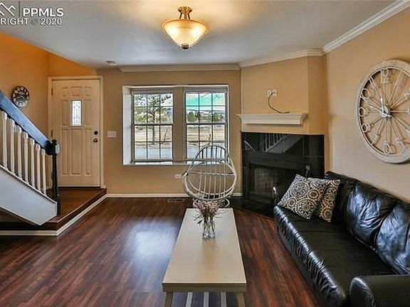 Great townhouse in the Rockrimmon area with a fenced yard. The main level has open floor plan with wood laminate floors. Cozy up in the living room with a wood-burning fireplace. The kitchen has breakfast bar, granite, and small pantry. Kitchen walks out to a private patio that backs to more green space- perfect for entertaining. The upper level has two bedrooms, both with vaulted ceilings and good closet space. One bedroom adjoins to a full bath. Storage area off the patio. The complex features a community pool, clubhouse, and open areas. Amazing location minutes away from I-25, shopping and restaurants. D-20 schools. Close to parks and trails. Owner pays for trash and HOA.