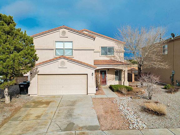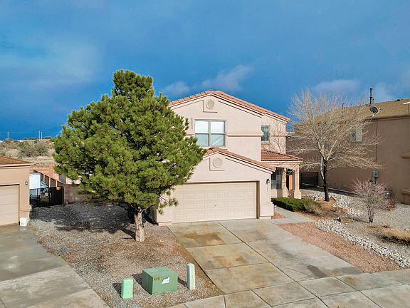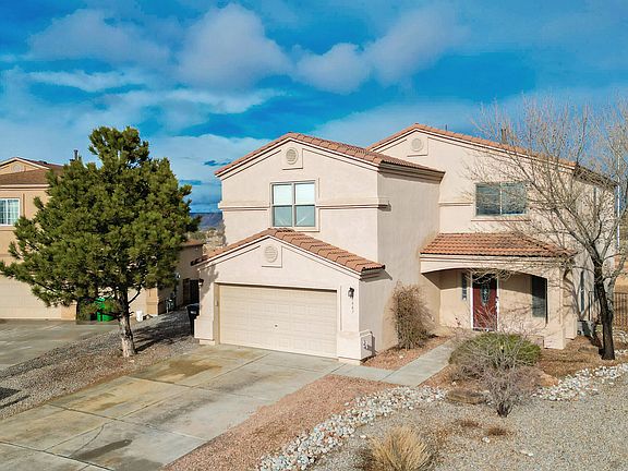 Check out this new listing in Rio Rancho, nestled within the V. Sue Cleveland High School District in Mountain Hawk Subdivision. No HOA or PID & home is completely CARPET FREE! Step through the front door to be greeted by new LVP flooring in both living areas & fresh paint. 2 great rooms provide ample space for entertaining. 2 fireplaces in the home (in the family room & two-way fireplace in the primary bedroom/bath). Kitchen equipped w/ stainless steeled appliances & walk in pantry/laundry room. The upper level includes a loft & 3 guest bedrooms & primary suite. French doors open up to the primary suite which features a balcony to enjoy the views. Primary bathroom includes a jetted tub, shower, double sinks & walk in closet. Backyard is completely walled for privacy. Welcome home!