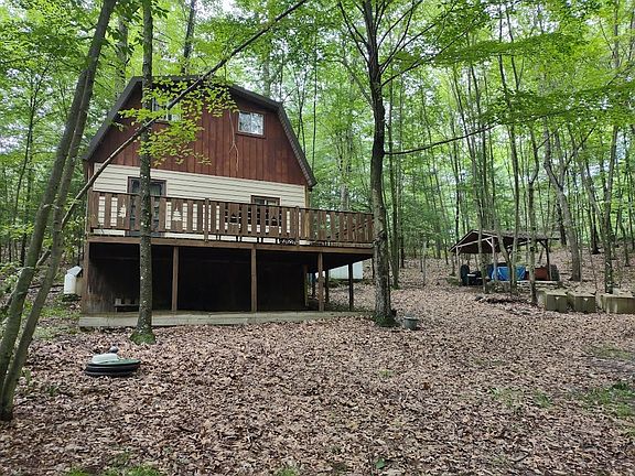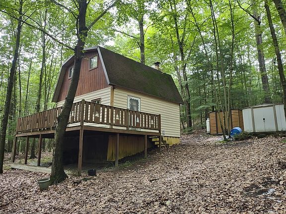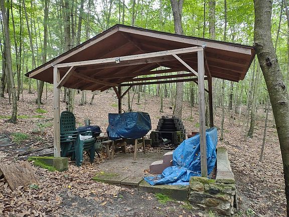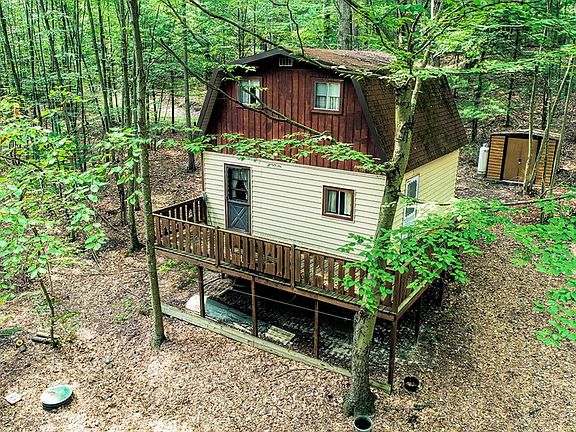 Secluded cabin on top of Warriors Ridge! Serene, rolling, 11.72 wooded acres, well and septic, generator and propane powered. Two lockable storage units. Small picnic pavilion with firepit. Cabin has combined kitchen and living room with tongue and groove pine walls. Large upstairs sleeping area separated by a wall. Feel free to make a drive-by appointment. No public utilities, generators used for electric. Excellent hunting reported in this area. Near excellent fishing rivers, Juniata and Little Juniata. Also near Lower Bike trail. Easy drive to Penn State.
