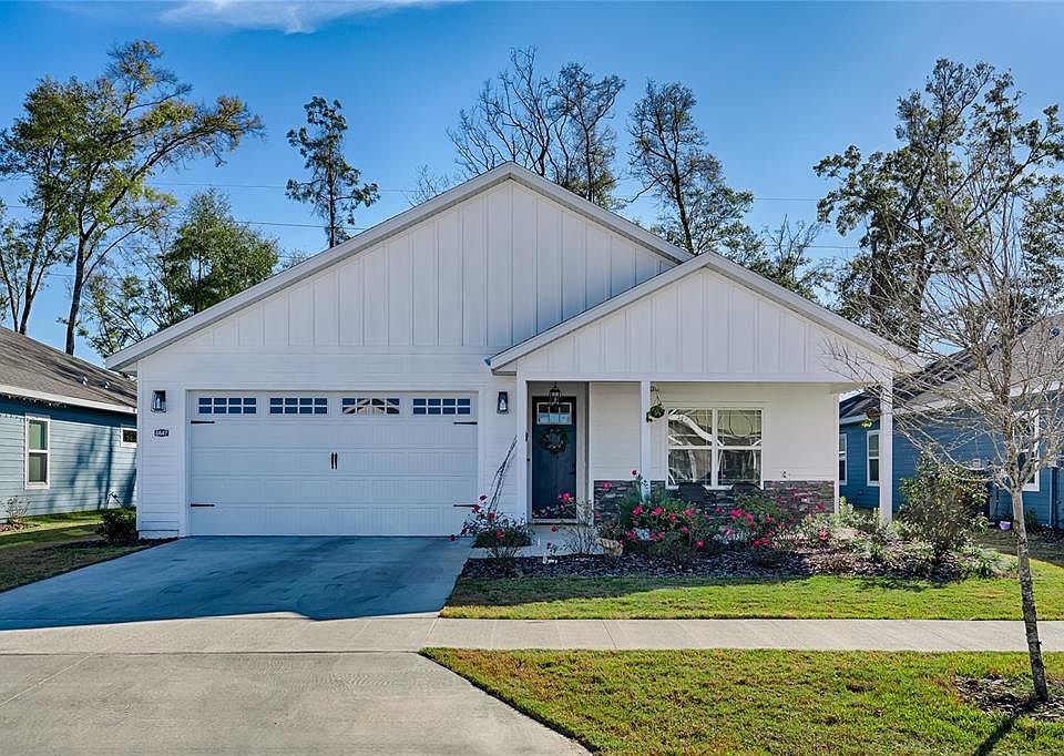 Stunning 4 bedroom/2 bathroom home located in Grand Oaks! This three way split home is move-in ready and features an open floor plan, high ceilings, over sized doorways, and consistent tile flooring throughout. The kitchen has beautiful quartz counter tops, farmhouse sink, Frigidaire stainless steel appliances, pantry, and large island with breakfast bar. Glass sliding doors along the back of the home open completely for a seamless view of the screened patio and backyard. The primary suite is spacious and has an en suite bath with a walk-in shower, dual vanities, water closet, and large walk-in closet. The owners have added electric window treatments in the living room and black out window treatments in the primary bedroom. The back patio is screened and opens to the fully fenced back yard. The laundry room has washer and dryer and storage shelf. The two car garage floor has been upgraded with industrial-grade epoxy. Enjoy the community clubhouse, pool, and playground! This home is conveniently located near UF, Shands, I-75, Markets West shops, and Archer road shopping and restaurants!