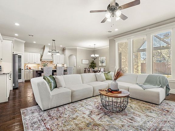 This stunning 4-bed, 3.5-bath home in Bixby's coveted Seven Lakes community offers 3,280 sqft of elegance. The main level features three bedrooms, an office, and soaring 10-ft ceilings, while upstairs includes a bedroom, bath, game room, and walk-in attic. Hand-scraped hardwoods, travertine tile, and custom moldings enhance the charm. The gourmet kitchen boasts a gas cooktop, stainless appliances (fridge included), and a walk-in pantry, flowing into open living spaces. A newly stained privacy fence encloses the backyard, and the 3-car garage features built-in Gladiator storage. Enjoy community amenities like a pool and clubhouse, with nearby schools, parks, and shopping.