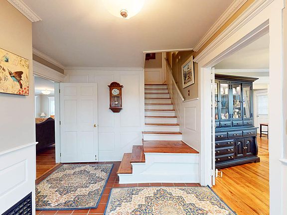 Modern Twist! Welcome home! This meticulously maintained classic New England-style residence combines historic charm with modern convenience, featuring 4 bedrooms, 2 baths, and 2691 square feet of living space above grade. Step into the tiled foyer and be greeted by a sense of timeless warmth and sophistication. The interior features updated lighting fixtures, refinished hardwood flooring, and exquisite dental molding throughout. The main level offers a spacious living area with a restored gas fireplace, perfect for cozy evenings with family and gatherings with friends. The white kitchen cabinetry, granite counters, stainless appliances, and gas stove make cooking a delight, while the oversized breakfast bar provides plenty of seating. The downstairs half-bath features an updated vanity and tile flooring. On the second floor, you'll find four spacious bedrooms, plus a bonus den/home office space with a beautiful stained-glass window. The upstairs bathroom has vintage tile flooring, a large tub, and separate tiled walk-in shower with glass door. Did we mention convenience?. Enjoy dual washer and dryer hookups, both upstairs and in the