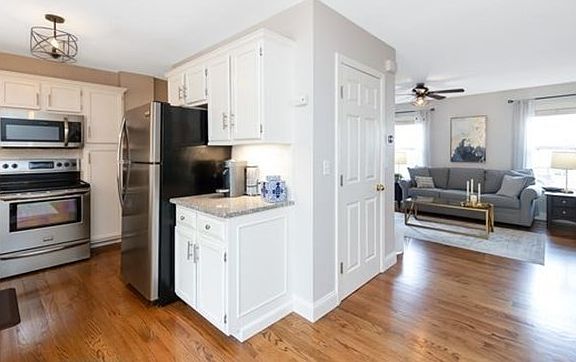 This is NOT a rental. Beautifully renovated 2 bed, 1.5 bath condo in Meadowe crest, move-in ready. Enter to a spacious open floor plan with living room, dining area, and kitchen featuring refinished hardwood floors, fresh paint, updated baseboards, and modern lighting. The kitchen boasts updated white cabinets, granite countertops, subway tile backsplash, under-cabinet lighting, and stainless-steel appliances with new dishwasher and microwave (2021). A three-season room off the dining area has new laminate flooring. Upstairs, find a main bedroom with two closets, a second bedroom, linen closet, and updated bathroom. Main bath offers a new oversized vanity with a Carrera marble countertop and modern tile flooring. Walkout basement includes a laundry area, garage access, and a finished room for versatile use. This unit features an alarm system, new AC unit (2021), furnace (2022) and W/D (2022). Complex has new roofs (2020) & low HOA fees. 1 cat or 1 dog (up to 40 lbs) Motivated to Sell