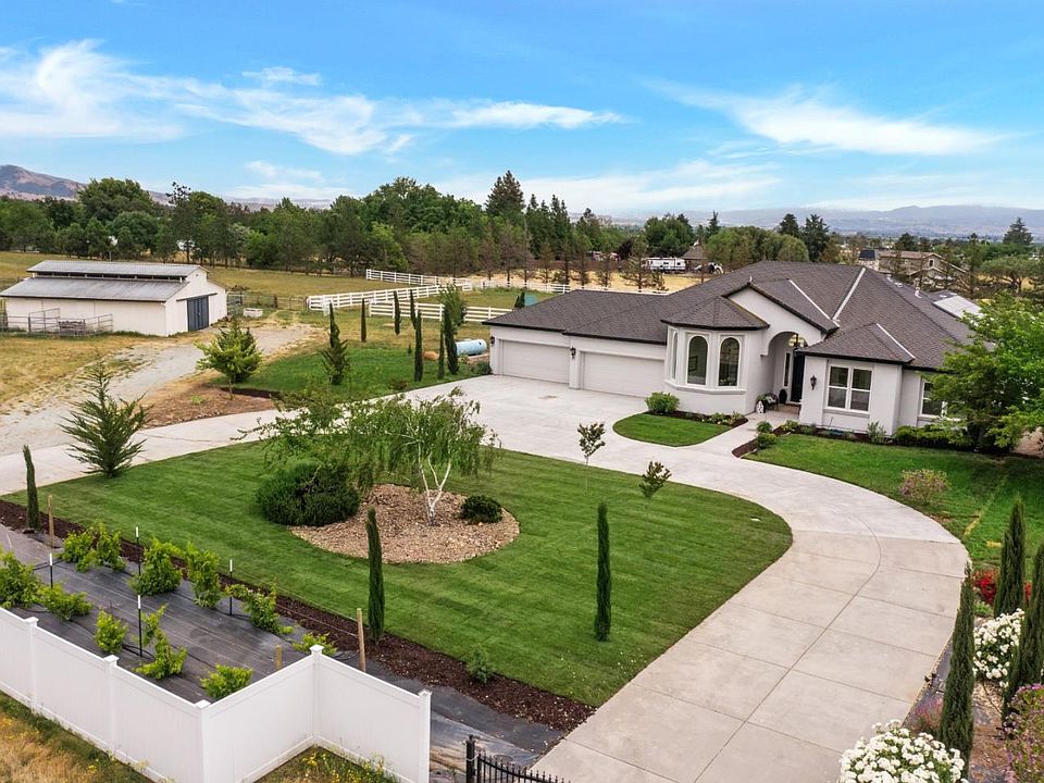 Classy Culdesac Enclave with Gated Gems! Captivating Updated Designer Interiors! Marvelous High Ceilings, Walls of Windows and Rich Plank Floors Enhance the Open Floor Plan! Separate Dining Room with Adjoining Butler's Pantry Makes Entertaining a Breeze! Stunning Kitchen Invites Family Gatherings with Superb Island and Separate Pantry. 4th Bedroom Used as Convenient Office! Laundry Room Provides Outside Access. Primary Bedroom Includes Custom Fireplace + TV Sitting Area, Spa-Like Bath with Sep Tub, Double Vanity and Walk-In Closet, Plus Slider to Garden. Lovely Pergola Covered Patio Overlooking Expansive Views of Acreage and Garden! Swing-Set for Play and Huge Barn for Animals! Picturesque Property Nestled Below Golden Hills!