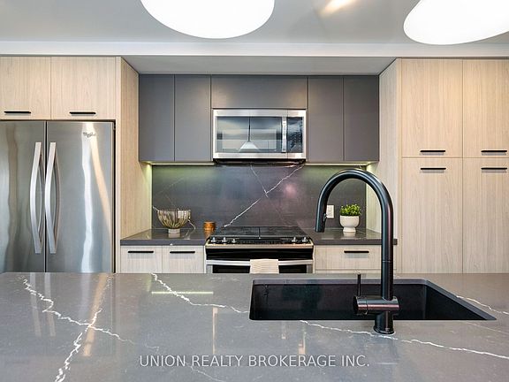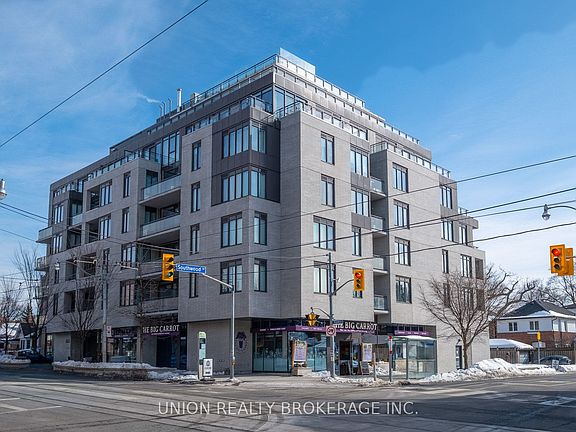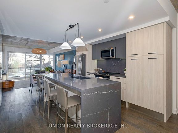 If you love a spacious home, the convenience of a walkable community, and never shovelling snow again, this is it! Experience luxurious living in this natural light-filled, south-facing 3-bedroom, 2-bathroom corner suite in the sought-after Southwood Condos. Offering 1,218 sq ft plus an over 200 sq ft private terrace overlooking the treetops, this home combines style, comfort, and function. The upgraded kitchen features a quartz waterfall island with a matching backsplash, stainless steel appliances, a custom built-in pantry, a deep black sink, black hardware, and additional custom storage. Thoughtful upgrades throughout include solid wood doors, redesigned hall closet with dual access, custom closet organizers, acoustic feature wall, pot lights, ceiling fans, modern light fixtures, surface tiles on the terrace, and blinds in all rooms. With square footage comparable to many two-storey homes, this suite offers flexible space in a vibrant, walkable neighbourhood. Leave your car in the underground parking -a grocery store on the main floor, two TTC lines at your doorstep, a quick walk to the Danforth GO Station (just 10 minutes to Union Station), Queen Street and Kingston Road shops, the lake and boardwalk, great schools, the YMCA, and more.