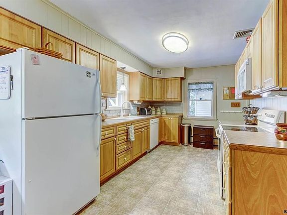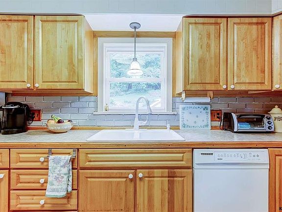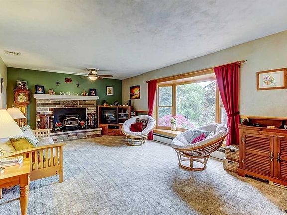 Quiet setting bordering a large wooded parcel. Over 2000 square feet when you utilize the lower level which includes a Family Rm, playroom, private office w/ fireplace and newer full bathroom. Main living room with bay window and wood pellet stove insert with brick surround. Some hardwood flooring and large eat-in kitchen.