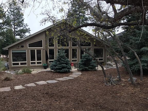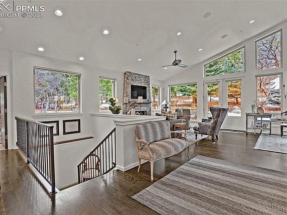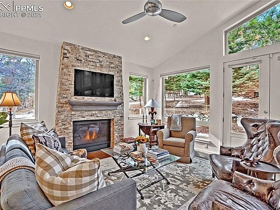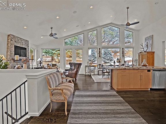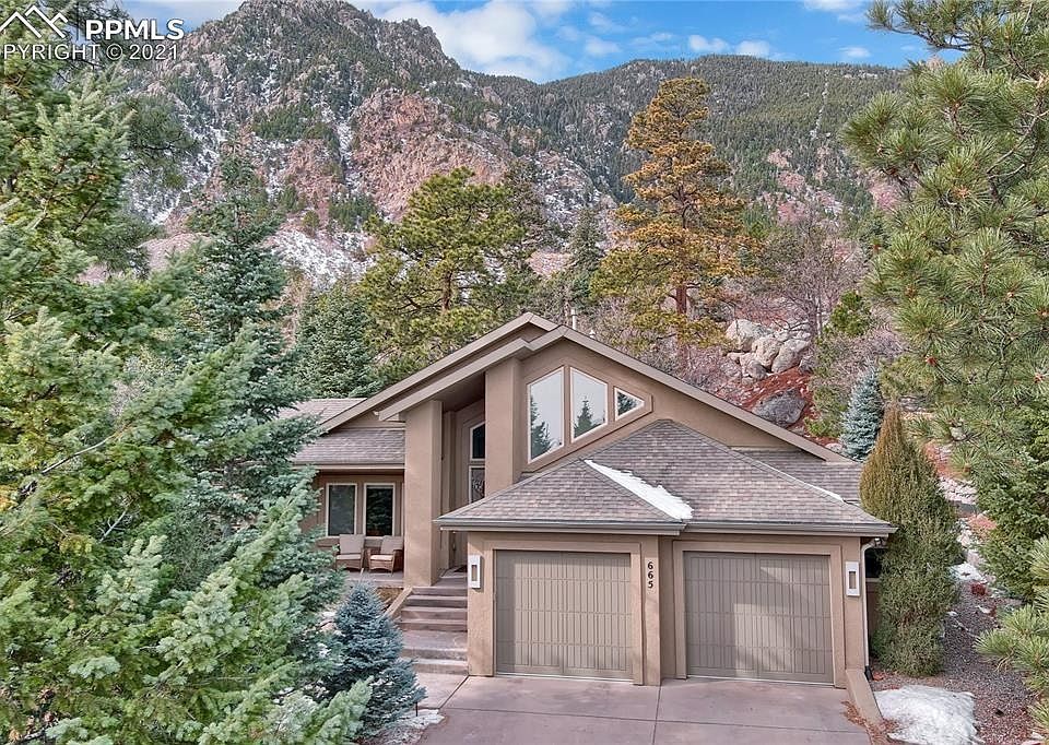Tucked away in a stunning mountain setting this private retreat offers all of main level living's finest amenities. Walk into walls of windows to soak in manicured treed landscaping with rock steps and views of rock formations. Wrap yourself in the luxurious designer contemporary feel that the open airy great room provides. Sit by the beautiful floor to ceiling stone fireplace as you enjoy your guests in large dining area with modern kitchen, with large center island and beautiful slab granite counter. Walk out to massive wrap around stone patio overlooking park like yard while you experience this private quiet setting. Wake up to mountain views in the serene master bedroom complete with 5 piece bath, double marble vanities, soaking tub and walk-in closet. There is a hard to find second master suite with attached 3/4 bath on the main level This very livable floor plan offers a study with built-in desk, and main floor laundry with sink, storage shelving and hanging racks. The sunny open bright lower garden level extends the living space with a large recreation room complete with kitchenette to include a refrigerator and microwave. There are two bedrooms with Jack and Jill Bath and a large 5th ensuite bedroom. A big storage room vault completes this lower level. Extras include elaborate art lighting, fire suppression system, and high-quality finishes. Located in award winning Cheyenne Mountain School District 12, next to Cheyenne Mountain State Park, just a quick and easy ride to shopping, Fort Carson the airport and downtown. Be prepared to be delighted and amazed.