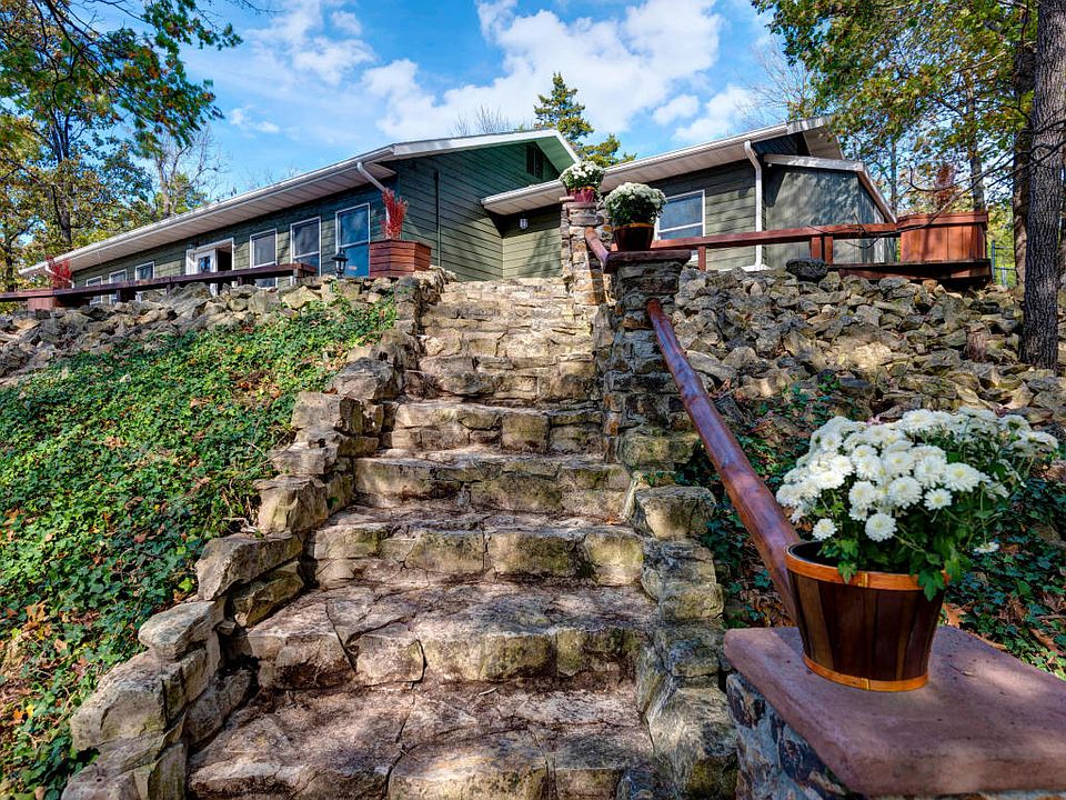 This newly remodeled 3 bed 3 bath 1.54 acre retreat is nestled in the woods, providing the ultimate private haven, complete with a LAKE VIEW of TABLE ROCK. There is an 1805 square foot drive-through garage/workshop - with it's own full bath. The home features a John Deere Room, attached garage, wet bar, and stainless steel appliances. Outdoor living space abounds at this unique property. The expansive wrap around deck/patio is perfect for private relaxation or entertaining. Nature is oh so plentiful in this peaceful setting, you may never want to leave. However, if you do, you can venture out to the public boat launch, which is less than one mile away! Or, take a very short drive and slip into the glitz of Branson. This exceptional home not one to miss!