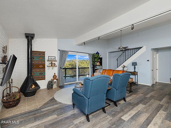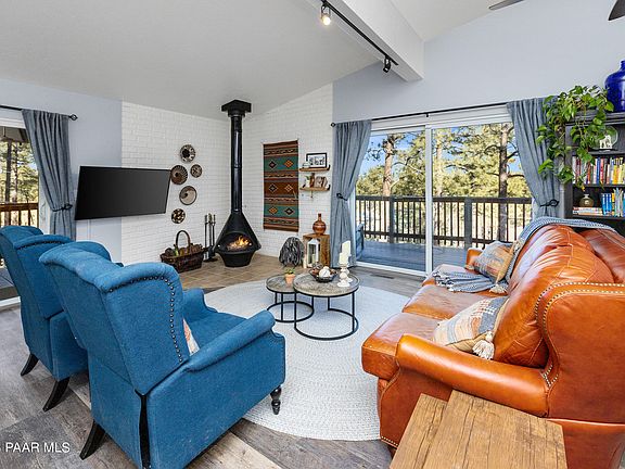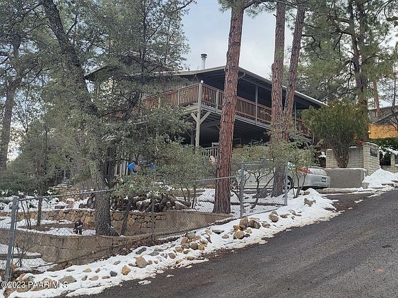 Spacious home in the tall pines of Mountain Club. Front steps lead to charming deck area for coffee and views. Once inside a toasty fireplace keeps you warm as you enjoy the views from the open great room, kitchen and master, all on one level . The trees continue to get more amazing in the two more bedrooms and bath up. Bonus of a single bed or flex room downstairs is great for company, office, exercise or your imagination. Arizona room is a perfect hobby/workshop and leads to the amazing backyard patio. The two parcels make this home one that is perfect for outdoor entertaining under the trees and stars. Just 1.5 miles from Whiskey Row makes it a perfect spot for access to Prescott's festivities and fun. Ask about additional property available.