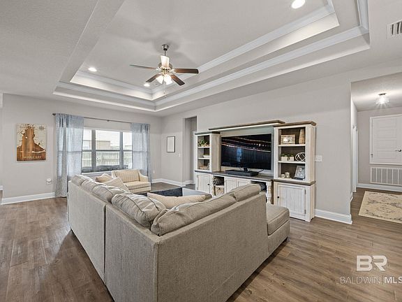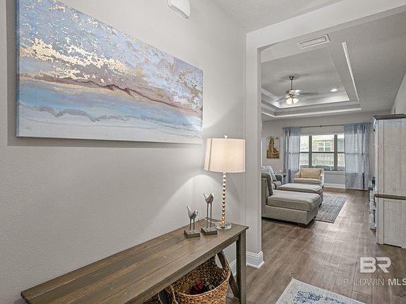 PRICED TO SELL! This beautifully updated, open floor plan home has been well-maintained, freshly painted and is move-in ready! From the foyer, your eyes will be drawn upward to the designer lighting, 9ft ceilings throughout the property, as well as the 11ft tray ceiling feature with crown molding in the living room and primary bedroom. Living room is spacious with ample natural light from the wall of windows. This home is IDEAL for entertaining with the LARGE island as you enter the modern kitchen! Tons of cabinet storage, stainless steel appliances, beautiful granite counter tops and generous pantry space. From the eat-in kitchen, you have easy access to the covered patio to relax & enjoy the spacious backyard, or fire up the grill! After a long day, cozy up in your luxurious primary suite with spacious walk-in closet & en suite bathroom with double vanity, private water closet, linen closet, soaker tub and separate shower. From the garage entry, there is a shiplap drop zone with bench, perfect for taking off your shoes & dropping your things. This home is conveniently located, just minutes from Fairhope shopping and dining. Also, with no through streets, this home is peaceful and quiet. Home is all one level, GOLD FORTIFIED roof will save you significantly on Insurance, fully brick exterior with soffit down lights along to front and an additional exterior door from the garage to the side yard. Buyer to verify all information during due diligence.