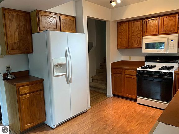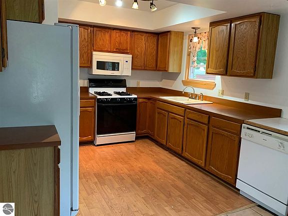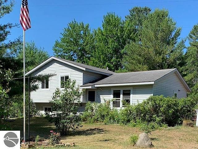 Surrounded by trees for privacy, sitting back off the road and a short walk to Birch Lake is this 2BR/1BA tri-level home in Kewadin on 1 acre. Main floor living includes kitchen with all appliances staying, dining room, and living room with entry. Upstairs there are two bedrooms and a full bath. The over sized master bedroom has large closet space. Head down stairs to the finished walkout basement with reclaimed wood walls from a local old barn, daylight windows, freshly painted floors and large pantry for storing can goods. The laundry room with the washer and dryer included. Back deck for grilling and a fire pit for s'mores. Pole barn with cement approach and floor, and a 12X40 lean-to. Housed in it's own shed is an outdoor wood burner stove that can heat both the house and garage if wanted. Forced air furnace in the house. Large garden area, and back yard. Close to accesses on Birch Lake and Elk Lake. Minutes to drive to Lake Michigan and Torch Lake.