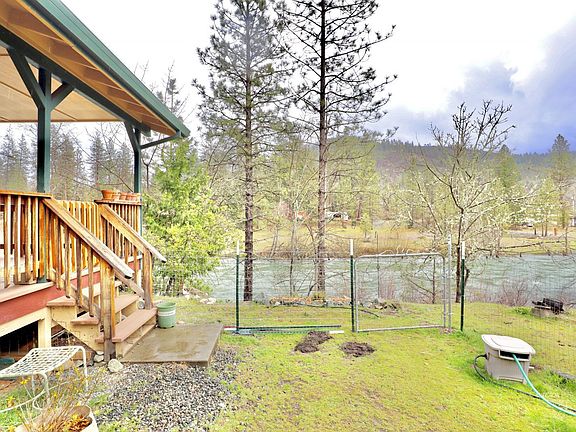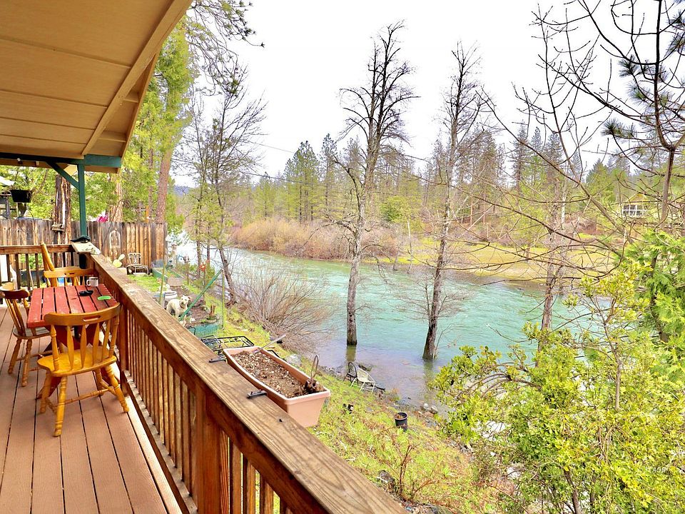 Riverfront Vacation Getaway Home, Workshop and Guest Studio. Soak in sun, splash in the water at your own riverfront vacation home on 0.4 acres. The home is new as of 2009 and well maintained since by the family as a vacation home. Occupied now by long term tenants until July 2024, the home is clean, with stone tile look-alike flooring, natural-look countertops and an open concept kitchen. There's a dishwasher and gas stove/oven. Wood stove winter heat coupled with central Heat/AC to keep you comfortable all year. Two ample-sized bedrooms each have their own unique views to the outdoors. Sliding glass doors lead to a wrapping covered porch thats just above the river, allowing you to enjoy indoor/outdoor seamlessness. There's a private grass lawn beach that disappears in Wintertime high water and reemerges in Spring for relaxing on beach towels and chairs. Huge garage workshop has about 900sqft man cave/billiards room with wood stove. RV garage parking and cabinets. It's insulated and well lit. Also on site is a guest studio with toilet and sink and washer/dryer hookups. Bring the family and start making memories here. BUYER to satisfy themselves as to all aspects of the property, via their own independent research, not that of Agent(s).