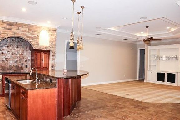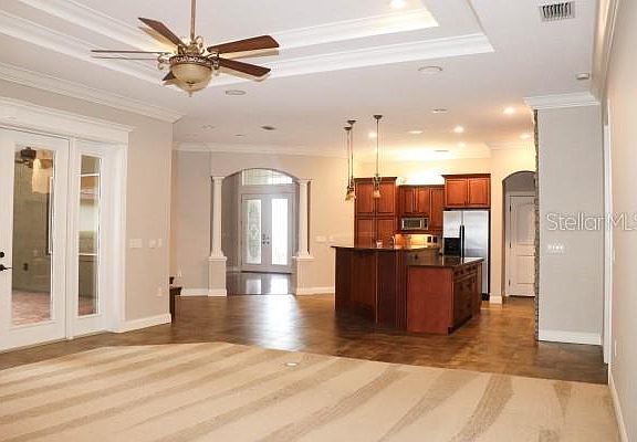 Beautiful custom-built home in the South Lakeland gated community of Crescent Woods. From crown moldings, double tray and coffered ceilings, custom millwork and wood floors, no detail is overlooked. Features a pool with hot tub and spill over and outdoor kitchen. The large master suite boasts a sitting area, his and her wardrobes and a master bath with a jacuzzi tub. Kitchen has dining that overlooks the pool, island breakfast bar, double ovens and granite counter tops. There is a formal dining room and study as well as a large game room. Upstairs features a theater with a 120-inch screen, Mitsubishi projector and 5. 1 Surround Sound.