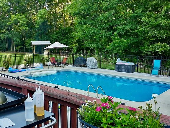 This property offers the perfect blend of comfort, and outdoor living. 2.7-ACRES. FULL BASEMENT. The heart of this home lies in its outdoor amenities. Imagine spending sunny days lounging by the inviting inground POOL, unwinding in the HOT TUB or relaxing by the fire. Deck is perfect for hosting barbecues or simply enjoying the privacy of surrounding woods. Unfinished basement features a large workshop and a recreational area, endless possibilities for hobbies and projects. As the day winds down, retreat to the primary bedroom that features a charming sunroom, offering a tranquil space to enjoy the beauty of the outdoors from the comfort of your room. Primary Bathroom has large soaking tub, separate shower, dual sinks, large walk-in closet. Environmental consciousness meets modern living with the addition of new solar panels, complete with a transferable warranty.