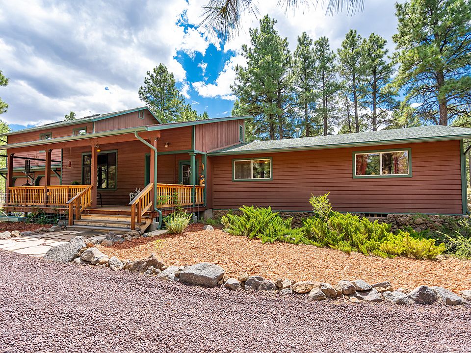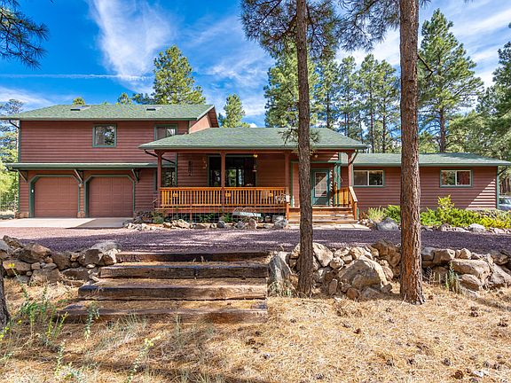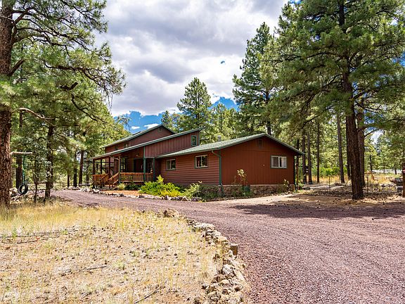 A mere 5 minutes north of Flagstaff and on a quiet country road is this stunning home on 5 acres of tall Ponderosa pines. This 4 bedroom home has had recent upgrades and additions, and is move-in ready. The large great room has a vaulted ceiling, opens to a wonderful office space and is steps from a brand new kitchen. The kitchen is a cooks dream and features rare stainless steel counter tops over custom cabinets. 3 bedrooms, a guest bath, family room and more are on the main level. Just upstairs is the bedroom suite with a huge en-suite bath featuring a jetted garden tub and lots of closet space. On 5 acres, there are attached and detached 2 car garages, plus a shop, great decks, gardens, sheds and full RV parking. See the 3D virtual walk-through tour of this beautiful mountain home.