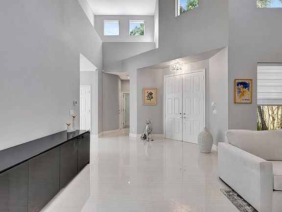 Welcome to this exquisite, renovated contemporary two-story home in the prestigious Broken Sound Club. Encompassing over 3,000 square feet, this residence epitomizes modern luxury and sophistication. The primary bedroom is thoughtfully located on the ground floor, offering convenience and privacy. Inside, you'll find stunning porcelain tile floors and soaring volume ceilings that enhance the home's spacious and airy feel. The gourmet kitchen is a chef's dream, featuring a waterfall center island and elegant marble countertops. The screened-in patio is perfect for outdoor living, complete with a private pool and picturesque lake views, creating a serene retreat for relaxation and entertainment. This home beautifully combines stylish design with functional living spaces, making it an ideal sanctuary in a coveted location.