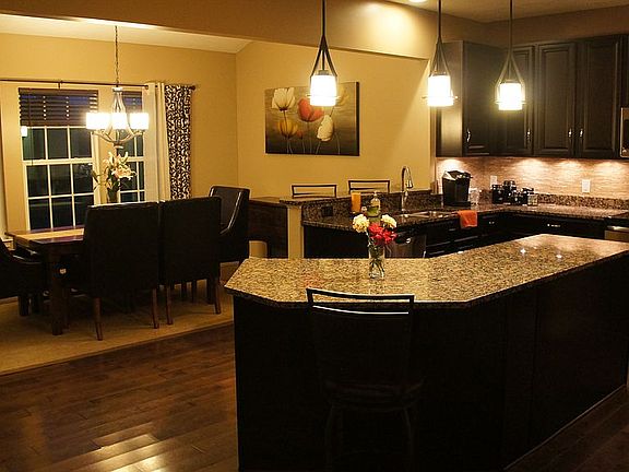 This home portrays easy-style and grace! The first level has real maple hardwood floors and a beautiful gas fireplace. A welcoming foyer leads right into a formal room, which can either be used as a living room or dining room. A hallway is flanked by a convenient powder room on one side and stairs leading up to the second level on the other. Through the hallway, the magnificent great room awaits and is large enough to accommodate a family of any size. The dining area and kitchen flow right from the family room. The large kitchen boasts granite countertops, a pantry, ample 42-inch cabinetry, stainless steel appliances, and a gourmet island. A convenient mudroom provides easy access to a two-car garage with a poured exterior third pad. Upstairs, four spacious bedrooms await, with two bathrooms, including a large owner's spa-like bathroom with double bowl vanity and soaker tub and separate shower. The master bedroom has real maple hardwood floors including the large walk-in closet. The second floor has storage space abound. The laundry room is discreetly tucked away on an upper level, making doing the laundry an easier chore. Outside you'll find a poured cement patio right off the dining area with built-in bar, waterfall feature, and lighting. The cement patio steps down onto a brick paver patio that includes a fire pit and additional water feature surrounded by beautiful landscaping.