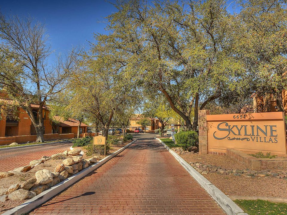 First floor end unit condo, SKYLINE VILLAS, perched above Tucson in the Catalina Foothills with city views immediately north of LA ENCANTADA Mall. Assoc amenities include clubhouse, pool, recreation room, spa, and tennis court. Assoc pays for common area maintenance, exterior front of unit, front yard, garbage collection, pest control, roof repair, roof replacement, and street maintenance. Desirable location north of La Encantada. Resort like setting! Ground Floor!!!! Desirable turnkey condo ideal for 2nd home or rental in premier Tucson Catalina Foothills. Close to District 16 Manazanita Elementary School.