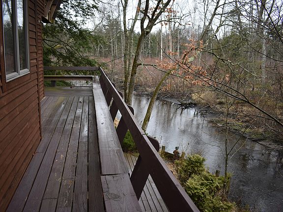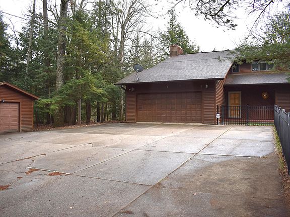 Year round Baldwin River home with 3 bedrooms and 3 bathrooms with plenty of room to entertain guests. Very unique location overlooking the confluence of the Baldwin River and the mouth of Sanborn Creek. Watch spawning fish from your tree house like deck. Walkway to the creek and river. Tastefully done open floor plan with eat in kitchen, The dining area and living room have tiled flooring with a fireplace . Quality construction with cedar siding and a large wrap around deck. Attached garage and additional one car garage for your vehicles and toys. Newer boiler heat system plus a mini split updated blinds, 2 year old generator and more. Plenty of room for storage with a bonus room upstairs and a non conforming possible 4th bedroom in the lower walkout level.