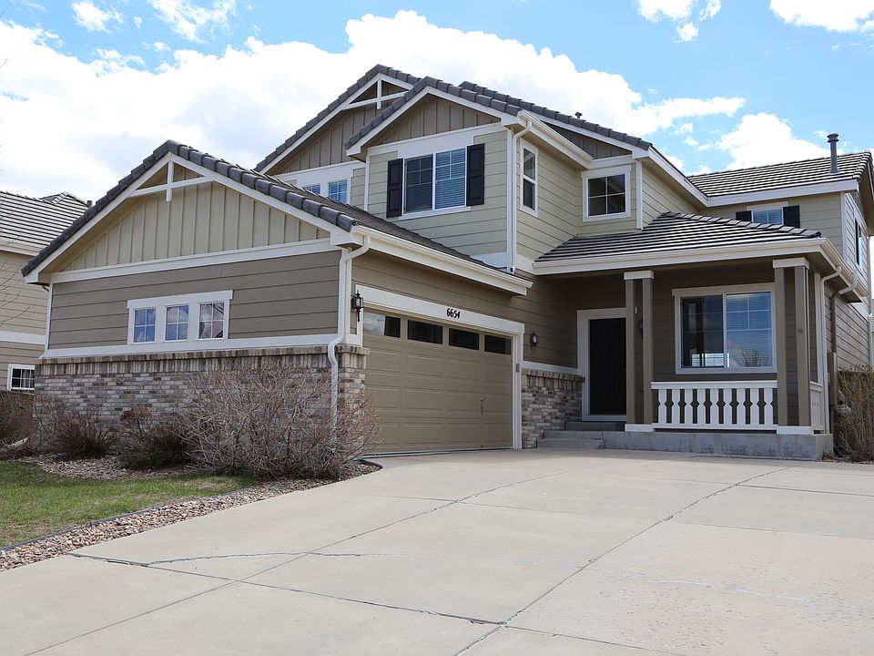 Welcome Home! This sprawling Castlewood Ranch home welcomes one right inside the door with a gorgeous wood trimmed stairway and vaults leading from formal living or dining room into a Kitchen with gleaming wood floors, quartz counter tops, an island, upgraded cabinetry & stainless appliances flowing to a family room that is anchored by a classic gas fireplace. Off the family room you will find main floor bedroom or study space with custom wall of shelving. Upstairs you get a taste of luxury with dual walk-in closets in master, large soaking tub, shower and dual sinks in master bath. Ease of living is apparent w/ second floor laundry. 3 additional spacious bedrooms with gorgeous mountain views. And it gets even better...This home is one of the rare finds in Castlewood ranch that features a FULL basement! Over-sized garage & mudroom reveal endless storage options. Outside you find an expansive concrete patio great for entertaining. Walking distance to schools. Home Warranty included!