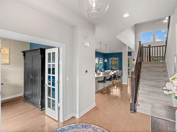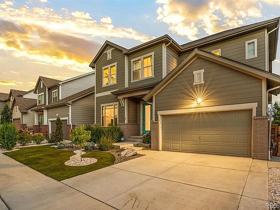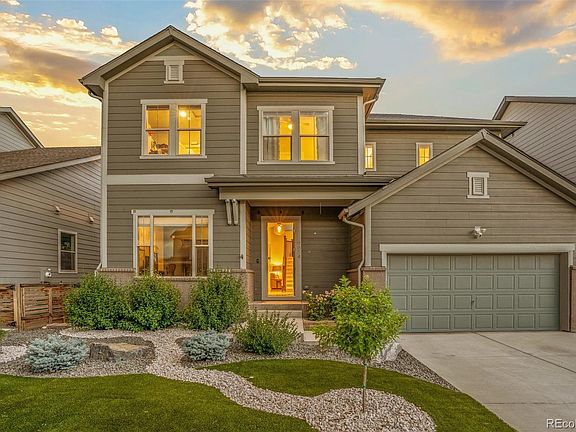 The perfect floor plan does exist! This David Weekley Aquamarine is an exceptional find, featuring a rare fully conforming 5th bedroom. Prepare to be captivated by the abundance of natural light that fills this home, accentuating its two-story great room overlooking trails, and fantastic open floor plan. Whether you're hosting gatherings or enjoying everyday family living, this layout is perfect for both. The heart of this home lies in its spacious kitchen, which seamlessly opens up to the dining area and great room with double sided fireplace, allowing you to not only host parties, but also be a part of all the action. Equipped with stainless steel appliances, a 5-burner gas cooktop, gleaming white quartz countertops, spacious pantry, and a huge island with bar seating, this kitchen is an entertainer’s dream. Step through the sliding glass doors, to back trex deck that overlooks green space. Working from home has never felt more luxurious in the main floor office with custom wall treatment and elegant French doors. The main floor also features a mudroom with built ins that leads directly to the 2.5 car garage, and a convenient powder room. Upstairs, discover a spacious primary suite, along with two additional spacious bedrooms and a full bath. The primary bath offers a luxurious "super" shower, dual vanity sinks and walk-in closet. Don't miss the walk out, which goes beyond the typical basement. With its 9' ceilings and a wall of windows, this space is open and bright. It features a 4th bedroom and full bathroom, as well as an additional family room. The 5th bedroom serves as a second office or provides additional guest accommodations. Step out to the maintenance free landscaped backyard, with 3 hold putting green, artificial turf, fence with key pad entry gate, and xeriscape. Access to over 20 acres of green belt open space and trails from the back gate. Easy access to I-25, I-70, and 36 to Boulder.