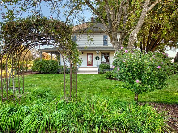 40 acres plus of grass seed&4 acre vineyard. Impeccably restored farmhouse boasts period detail w/modern functionality. Steeped in rich history this home is drenched in sunlight w/spectacular views from every window. Den/bdrm on main.4 bdrms up. Enjoy gleaming hrdwd floors, blt-ins & custom chef's kitchen w/eating nook&family room.Picturesque oasis w/garden,tea house & outdoor seating area.Tasting room.2 car garage.Great horse property potential! Just 10 min to Salem. Seller financing option.