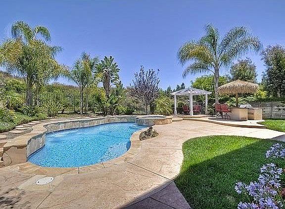 Seller will entertain offers between $899,950 to $949,950. A must have, over 8,000 square ft lot in Aviara with a gorgeous pool! Whether it’s the impressive formal living room with soaring ceilings & crown molding, the beautiful chef’s kitchen, or even the awe inspiring backyard, this former model home has something to offer for your entire family. Be amazed by this light and bright floor plan as you enter this home through beautiful double doors. Natural light floods in through numerous windows, with views of the pool and landscaping. Continue to the chef’s kitchen featuring granite counter tops, breakfast bar, eat-in dining area, double oven and center island. Off of the kitchen you can find the entertainer’s family room w/ fireplace that opens out to your stunning backyard. This exquisite home offers a resort like backyard that is the entertainer’s dream with sparking pool and spa, built-in BBQ grill, and elevated dining area. Enjoy ultimate privacy with no rear neighbors. The first level also features a bedroom with private bath. Upstairs you will find 2 large bedrooms sharing a jack and jill bathroom. The oversized master suite features double doors, large windows and canyon view. Private en suite bathroom with soaking tub, walk in shower, his and hers sinks and walk-in closet make it a retreat of its own. Additional features include: central A/C, central vacuum, crown molding throughout most of house, 3 car garage, loft area perfect as office/library, and so much more! Dining room chandelier, garage refrigerator, washer &dryer, garage work bench do not convey.