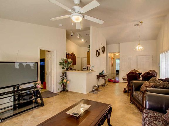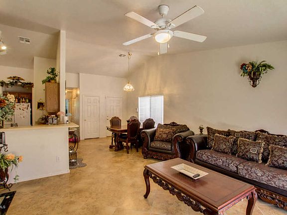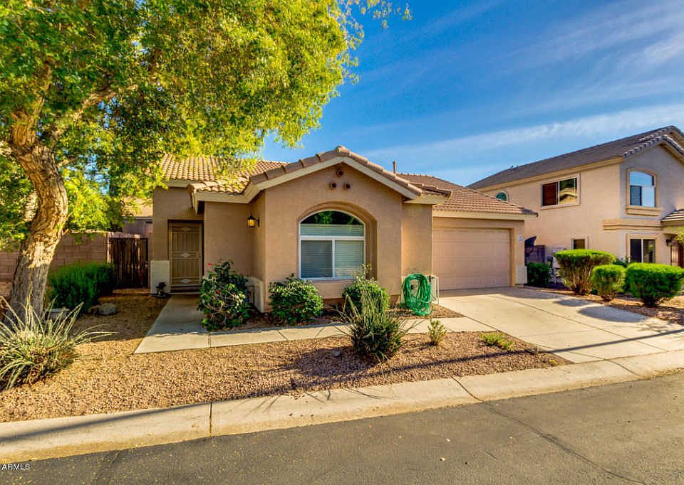 Lovely & hard to find 2 bed 2 bath home in the Gated Community of Mountain View. The home features an open floor plan with vaulted ceilings and updated 18' tile flooring. The kitchen has beautiful raised panel cabinets, breakfast bar, ample counter space, new sink, new faucet and new built in microwave. Master suite has vaulted ceilings, a large walkin closet, master bath has dual sinks. The 2nd bedroom features vaulted ceiling and a large closet. The very private back yard is one of the larger lots in the community and features a covered patio, paved area for sitting or firepit, extra high wall for privacy. Easy to care for desert landscaping, new coach lights & a 2 car garage. Conveniently located near restaurants and shopping. Community Club House, pool, spa, workout facility & more.