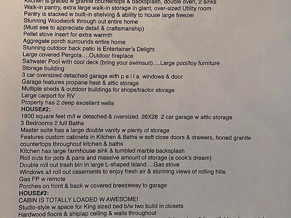 HOMESTEAD IN STYLE! ONE OF A KIND ESTATE! 198 acres m/l, 2 homes, 1 cabin & 9 ponds will come with this purchase. House#1: 5B/3ba luxury estate home. Stunning woodwork. Master/walk-in closets, whirlpool tub/huge shower. Bonus room. 2 heat/air units. Granite in kitchen, double oven, walk-in pantry, giant utility/pantry! Porch surrounds, pergola/outdoor FP, saltwater pool/deck. Tornado shelter. Sheds/shops/carport/3car garage. 2 wells. ENTERTAINERS DELIGHT! House#2 & cabin & land. $1,400,000.00