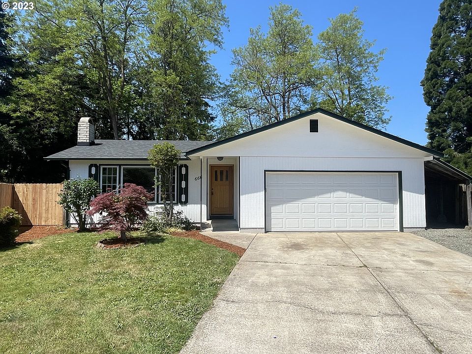 Welcome to another Hyland Restoration home! Brand new roof, furnace and heat pump, interior paint, and carpets. Enter to a spacious living area with a wood burning fireplace, as well as an open concept kitchen and dining room. Primary bedroom features an ensuite half bathroom with a granite vanity and newer fixtures. Two additional spacious bedrooms and a full hall bathroom with shower/tub combo. Attached two car garage, covered storage and interior utility/laundry area. Entertainers will delight at the spacious back deck off of the dining room, overlooking the large, maintained backyard. Don't miss this home!