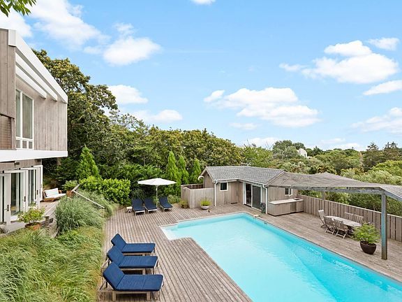 * Available any two weeks in July and August. Exquisite, one of a kind, south of the highway retreat in the highly desirable Amagansett dunes, ideal for a dreamy summer experience. This beautiful home was designed with luxury, privacy and effortless living in mind. Drive through electric gates and escape into a spacious, sun filled oasis where no detail has been spared. Perched high on the dunes with panoramic ocean views and a short stroll to the beach, it features an unrivaled indoor/outdoor living flow for relaxation and unforgettable summer moments. This beautifully designed sanctuary features four bedrooms and four bathrooms located throughout three floors, providing extra privacy and spaciousness for all. Sleep comfortably on Coco-Mat mattresses and crisp Matteo sheets in every bedroom and rejuvenate in the steam shower and oversized soaking tub in the master bedroom suite. Sip your morning coffee in one of multiple, sun drenched lounging areas offering choices of retractable glass doors opening onto expansive decks or 12 foot floor-to-ceiling windows framing a 180 degree peaceful view of the Atlantic. Stroll to the lower level for an early swim in the 20x40 pool or relax in the sunken 6x8 stainless steel spa. Create a tasty meal in the chef's kitchen with a double oven and a griddle for your morning pancakes, double door SubZero refrigerator, extra subZero built-in refrigerator drawers for cold drinks and dual Bosch dishwashers. Or barbecue under the stars with the top of the line gas and coal grill with rotisserie and smoker. Gather around the indoor/outdoor fireplace on cool nights while lounging on comfy, inviting couches or enjoy carefree meals with friends under a massive cherry tree during warm days. Two retro cruiser bikes will make the five minute walk to the beach even faster or the morning Amagansett village stroll an effortless escapade. Read your book in the cozy pool cabana house while listening to the multi-zone, indoor/outdoor sound system. Share fun moments playing pool on a beautiful, modern, professional size pool table. Grab a yoga mat, TRX or some weights for an at home workout, or head to the beach with one of the surf boards when the waves are beckoning. Don't miss the chance to make perfect summer memories at this truly exceptional hideaway in the highly coveted Amagansett dunes