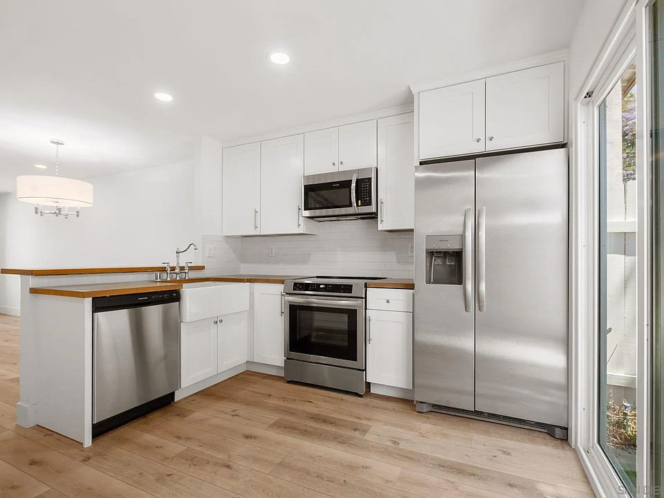 Stunning custom luxury remodel designed by Adrienne Kravchuk Interior Designs. Beautifully renovated townhome in the highly coveted, tranquil San Carlos neighborhood. Nestled in a park-like setting, this home greets you with an open concept living area complete with new waterproof luxury vinyl plank flooring throughout, recessed lighting, all new soft close cabinets, stainless steel appliances and butcher block cabinets matching the custom wood railing. The upstairs retreat is outfitted with two bedrooms, a fully renovated bathroom with high end marble tile floors, and ample closet/storage space in hallway. The private, low maintenance turf grass backyard is a perfect place for dining or entertaining guests. Both children and dogs will enjoy easy access to the extra space in the adjacent greenbelt through your private gate. Covered carport with plenty of room to park your cars in the assigned, tandem spots and store your belongings in personal storage cabinets. Community full sized laundry is extremely convenient and located in your garage only a few steps from your front door and is only shared with 4 other units. With only five units in the building, one shared wall, and greenery space behind, this quiet, private home is the perfect place to relax after a long day.