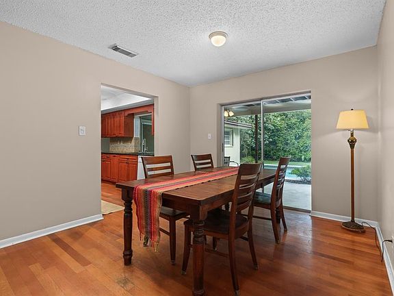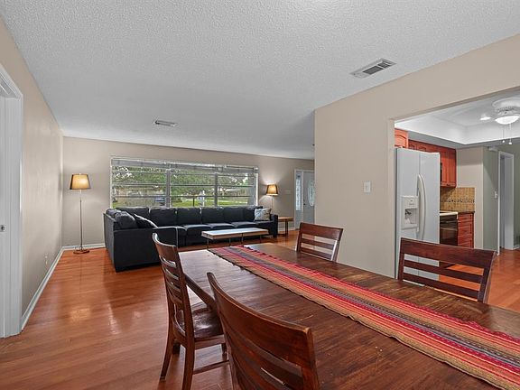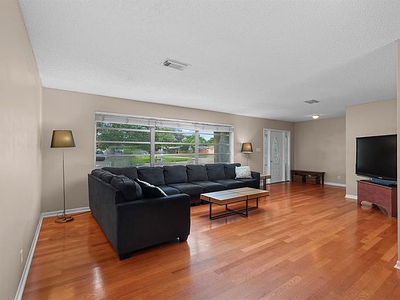 This true 4 bedroom 2 bathroom plus den home sits on a 1/4 acre lot with an oversized 2-car garage in the highly desirable neighborhood of Lakeview Estates! The home features wood floors with a split floor plan for privacy. The large windows and pocket sliding glass doors let in an abundance of natural light. Enjoy the backyard oasis with a covered patio and pool, perfect for relaxation and entertaining. The cabana baths offer convenient access to the pool area. A fenced yard with a 10-ft wide gate is ideal for boat or RV storage. NO HOA! Recent updates include A/C (2022), water heater (2019) and pool pump (2024). Conveniently located near excellent schools, Happy Tails Dog Park, Seminole Park with pickleball courts and a playground, major highways, shopping & more.
