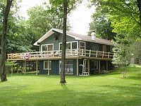 Fantastic chain property! Large 5 bedroom, 2 bath home on a level lot with huge grassy front lawn, sand beach and sandy swimming. The lot boasts 200ft of frontage, a boathouse, 2 car garage, nice landscaping and a paved drive. Inside you will find an open living space with large lakeside windows, vaulted ceilings, brick wood burning FP, wood T&G walls (great "Northwoods" appeal), walk-out lower level and a wrap around sundeck with newly added lakeside seating area. The complete package for the taking!