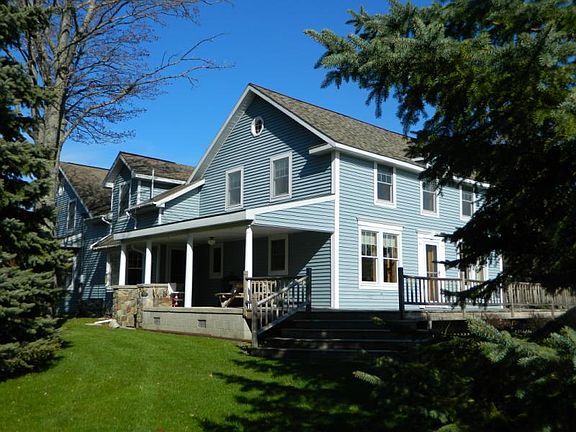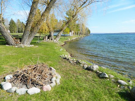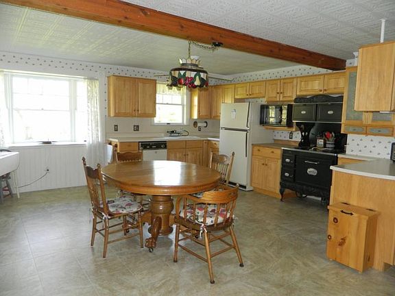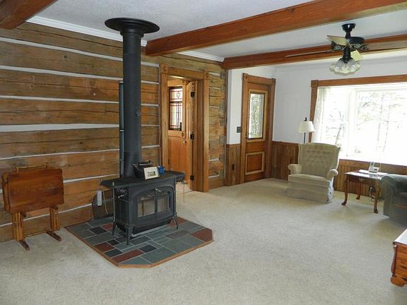 You'll enjoy beautiful sunsets from the deck of this magnificent historical home, it sits on a one acre lot with 175’ of frontage! This home also holds some history of the lake with hand hewn logs which are left exposed in different areas throughout the house. Large country kitchen with light hickory cabinets, living room features a Vermont Casting wood stove; both rooms have large bay windows. Lakeside sitting room and master bedroom with 1/2 bath have a terrific view of the lake. Upstairs & lakeside, hosts 2 large bedrooms and full bath. Hardwood floors. Also, large unfinished bonus room that is plumbed for 3rd bathroom; ready for your needs, additional living space or simply storage. One car attached garage, 2 car detached garage w/lean-to. Blacktop driveway.