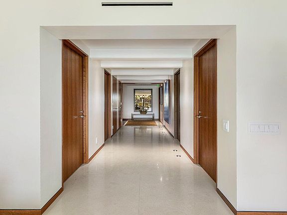 The primary suite is a private retreat, with breathtaking ocean vistas, a separate office/study, and three custom-designed closets, including an oversized walk-in. The spa-like en-suite bath features a dual vanity, separate makeup station, and a glass-enclosed shower with with bespoke limestone tilework.