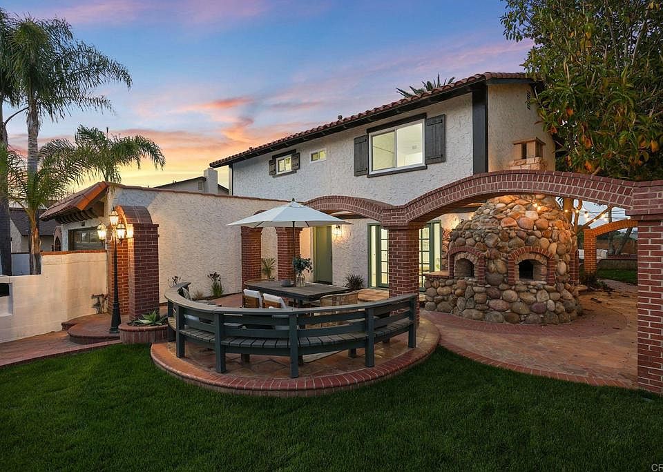 Located in the heart of University City, this home offers incredible views over UTC and is only minutes away from top-ranked UCSD, UTC Mall, the New Trolley Stop, and world-renowned beaches. Meticulously reimagined by Maverick Design, this captivating residence will enchant you from the moment you step into the gated front yard, where an inspiring custom pizza oven and brick archways set the stage for perfect al-fresco dining and entertainment. Inside, the formal living and dining nook are surrounded by three sets of beautiful French doors, flooding the space with abundant light and granting access to the front, side, and back yards. The freshly remodeled kitchen seamlessly connects both dining areas and features two-toned European-style cabinetry, brand new stainless steel appliances, customed designed fluted range hood, and stunning views of the back yard and UTC skyline from its Calacatta quartz countertops, brass accent fixtures, and designer-selected backsplash. The formal dining room, located off the kitchen, offers another set of French doors, a cozy fireplace, and a fully remodeled half bath with custom tile floors and a designer vanity. Upstairs, the Primary Bedroom Suite and three secondary bedrooms await, each with its own charm. The Primary Bedroom Suite boasts incredible views and a fully renovated bathroom with a glass-enclosed shower, marbled textured tiled floors, and a designer dual vanity with brass accent fixtures. Outside, the backyard provides ample play and entertainment space, complemented by a central water feature and panoramic skyline views. Additional features include AC, new vinyl dual-pane windows throughout, and white oak engineered hardwood floors. Don't miss out on this charming University City home – schedule your private showing as this charming University City home will not be around for long.