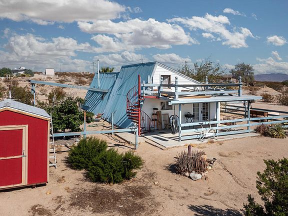 Top of the world, A-frame hide-away home. Set on 2.5 acres with a private desert setting & skyline views. A touch of TLC & this house will shine. High up in the Copper Mtn Mesa neighborhood of Joshua Tree. Peace & serenity. Panoramic vistas of the Bullion Mtns, Copper Mtn, the Little San Bernardino Mtns, & Mt Nebo. Large foyer presents opportunities for many uses such as a lounge, art room, or a guest area. Living room enjoys high ceilings with shiplap wood panels, tile flooring, & glass french doors that lead to the patio. Kitchen with refrigerator, dual basin sink, long counter tops, cupboards, shelves, stove & cooktop. Office/den area that acts as a sunroom with ample natural light from the glass doors. Stackable laundry in the closet. An additional room that can be optimised for several uses, dining area, 2nd bedroom, a study or hobby room. Bathroom with tile & shower. Ladder steps lead to the expansive loft bedroom which features a door to the stargazing deck. The elevated deck presents the quintessential perch to gaze at the inspiring desert ambiance. Pergola carport. Outdoor shower. Covered patio for relaxing in the shade. Cactus garden, shade tree & a date palm. Cowboy tub with endless vistas. Approximately 27.5 acres of open space BLM land directly east which offers plenty of room for riding horses, hiking, & dog walking. 19 miles to the Joshua Tree National Monument where annually about 3 million tourists visit the park. 47 miles to Palm Springs. 141 miles to LA.