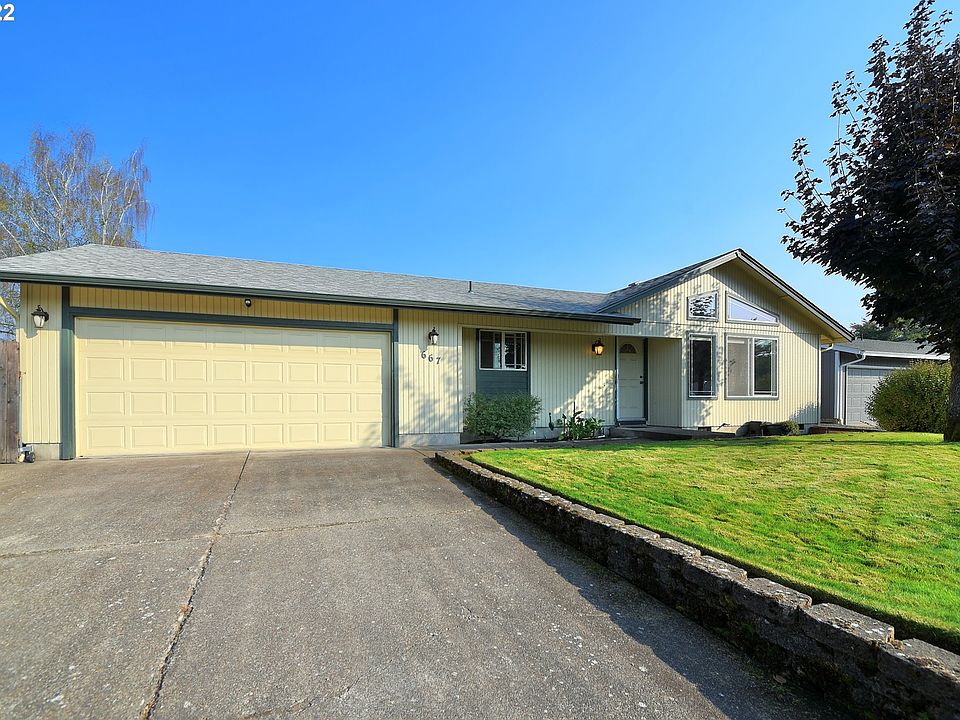Well-maintained home in a quiet Thurston neighborhood, just minutes from schools, parks & shopping. Move-in ready with gated RV parking, fully enclosed yard, large storage shed, easy landscaping w/mature trees, expansive back deck for entertaining, vaulted living room, great natural light, breakfast bar, beautiful wood floors, and an owners suite. 3BR/2BA in 1,166 sq.ft. with excellent separation of space, 2 car garage with W/D hookups, dishwasher, ductless heating/cooling all on a single-level.