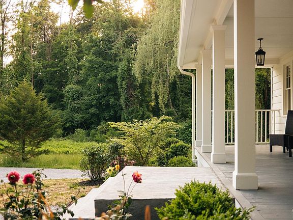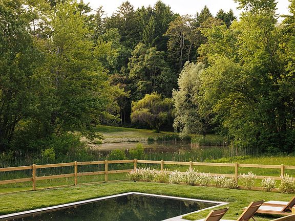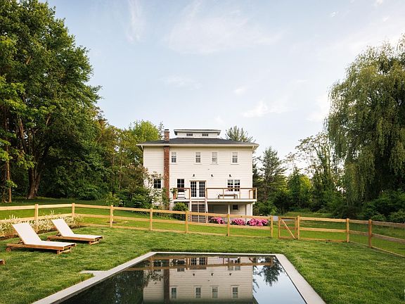 A sprawling farmhouse set on ten acres with a pond and heated saltwater pool, perfectly situated in the Hudson Valley between Rhinebeck and Hudson. Set back from the road down a long, circular driveway, the home is framed by willow trees and blooming perennials, and the whimsical covered porch is reminiscent of iconic Southern architecture. Enter through a mudroom into a wide, gracious foyer where the original tin ceiling is still perfectly intact and painted a luminous glossy blue that sends natural light dancing about the space. A classic four-square configuration, you'll find four rooms off of the central hall. The kitchen sits in the northeastern section of the south-facing home, it is designer renovated perfection with custom, inset cabinetry and a plate rack hung above the farmhouse sink that looks to be plucked right out of a Cotswolds cottage. You'll find a Wolf range, loads of storage, integrated appliances and a large center island. The kitchen leads into the dining room where a Brooklyn artist has handprinted a mural to cover the walls and painted the ceiling a bright and unexpected pop of green. Across the central hall lies a light filled, large living room with build in cabinetry and a woodburning stove. This area leads into the study, painted a moody blue which contrasts beautifully with the bright home. Upstairs, four well-sized bedrooms. The primary suite features exposed beams on the ceiling and a wonderfully sizable walk-in closet. The ensuite primary bathroom has a soaking tub, a separate shower lined in handmade tiles, and jack-and-jill sinks. Two additional bedrooms share a full bath off of the hallway, and another ensuite bedroom lies at the back of the house next to the laundry room. The magic is in the details here, with hardware from Waterworks, unlaquered brass light switches from Forbes and Lomax, and vintage lighting sourced primarily from Italy. Brand new mechanicals. Outside, a sundrenched backyard is the perfect backdrop for the heated, gunite, saltwater pool overlooking a beautiful pond. The ten acre parcel is private and wonderfully dynamic with lawn, woods and water. 2h to NYC and 15m to Amtrak and in the Red Hook school district, this house is pure Hudson Valley charm.