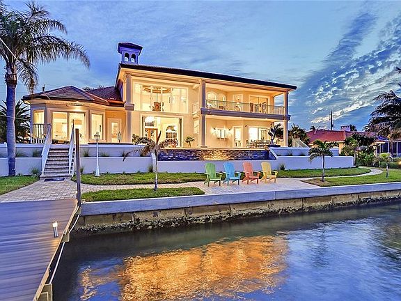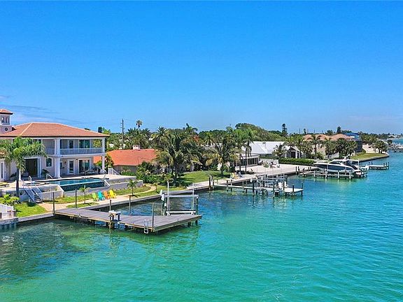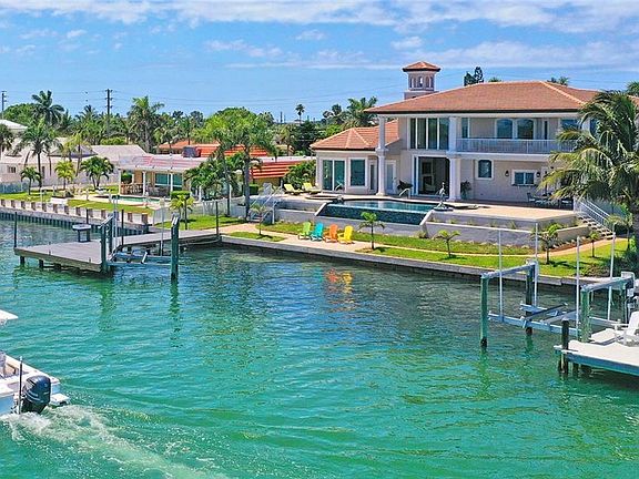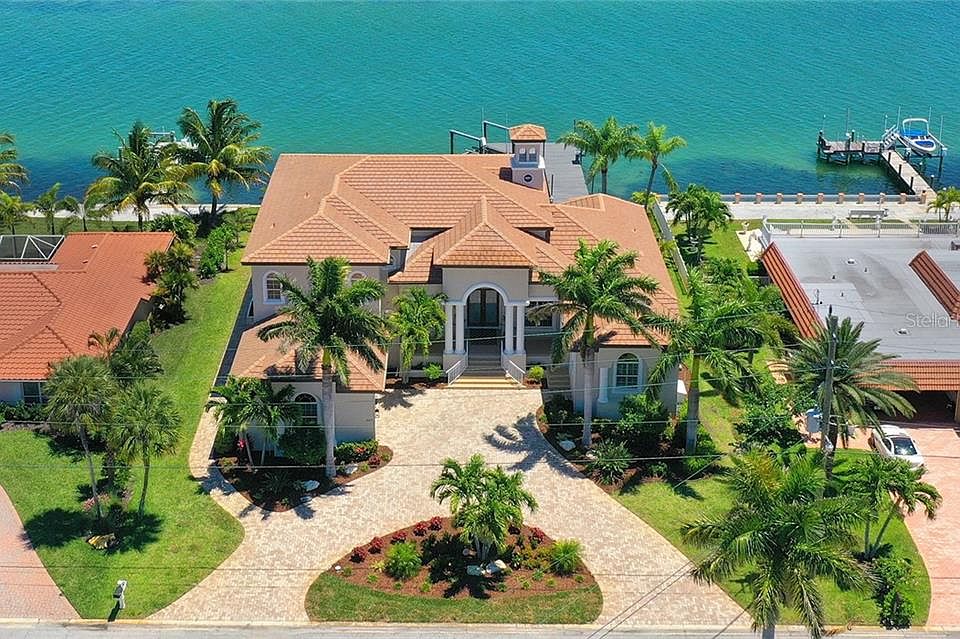 Anna Maria Island waterfront paradise on Key Royale with immediate access to Tampa Bay and the Gulf of Mexico. Wide-open bay views with the Sunshine Skyway in the background. Located just one block from Key Royale Club, the only golf and country club on the island. This stunning home has commanding curb appeal and solid concrete block construction from top to bottom. The timeless interior features high ceilings, open living space, elevator, and oversized windows that frame the impressive water view. The home's 4,651 sq. ft. includes 5-bedrooms, 4.5-baths, bonus room, office/den, open living area with living room, dining room, wet bar and kitchen. The living room extends up to a 2-story octagonal tray ceiling and delights with an impressive water view. The high-end kitchen features Thermador Professional cooking appliances, eat-in island and solid-wood cabinetry with granite countertops. The spacious master retreat and en-suite bath on the first floor are perfect for pampering the restful side of life. Two guest suites on the first floor and two bedrooms that share a bath on the second floor complete the sleeping quarters. This waterfront home opens up to an outdoor setting where exceptional living continues -- covered patio with outdoor kitchen, heated pool/spa, and deep-water dock with boat lift. Located on a quiet, dead-end street in Key Royale on north Anna Maria Island, you are just minutes from white sand beaches, and quaint shopping and dining. A coastal paradise on Florida's Gulf Coast.